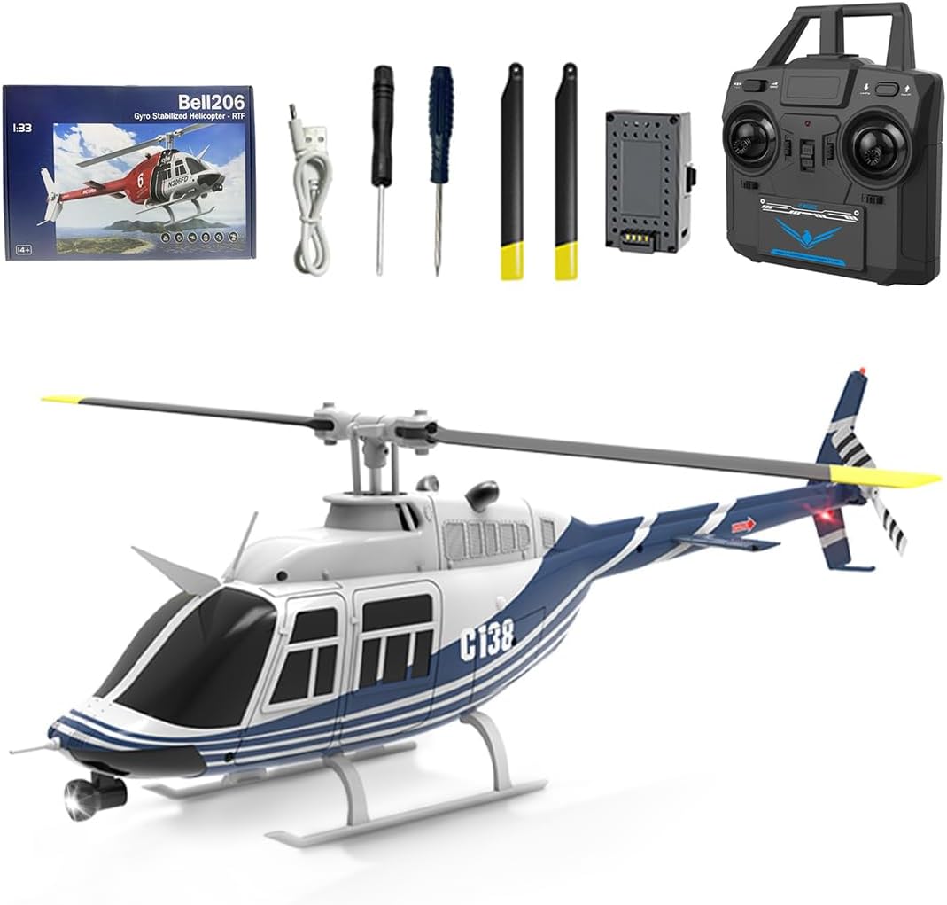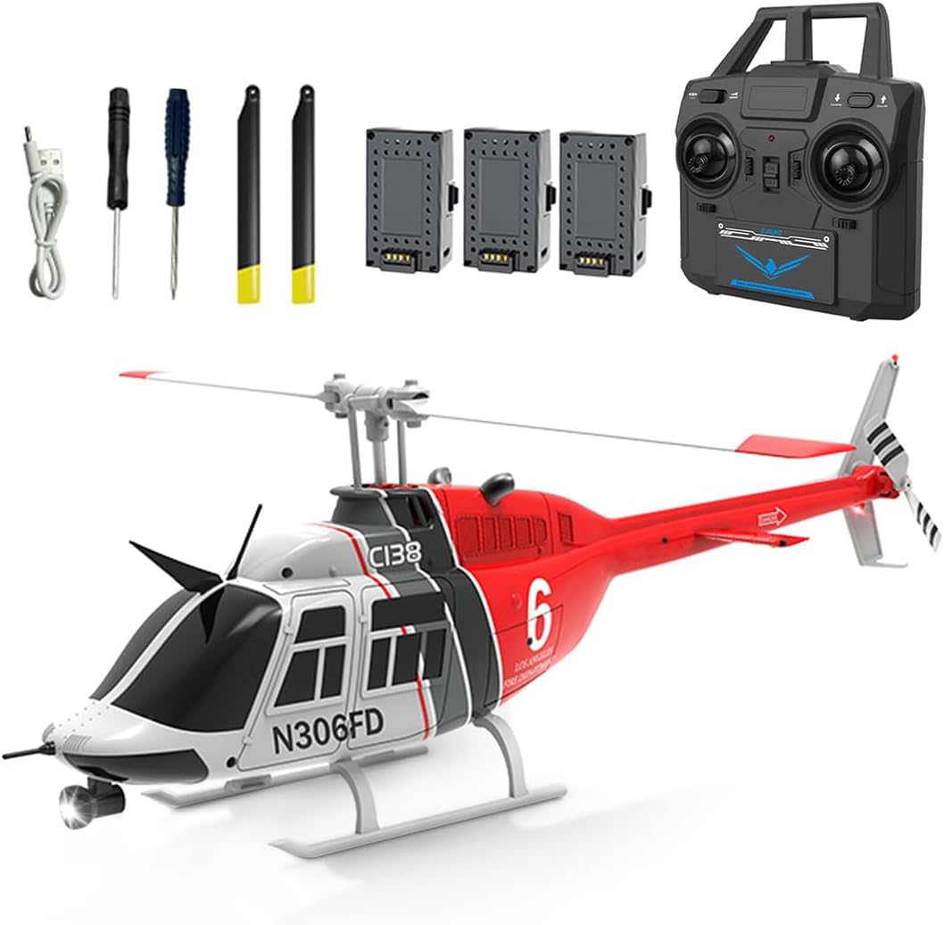 RC ERA C138 1/30 Scale 206 Helicopter 2.4G 6CH No Aileron Helicopter with Altitude Hold and Optical Flow Positioning (RTF Version/Red & Black & White)Specifications:.Color: Red & Black & White.Material: PA/PC.Model: BELL 206 6CH Single-Rotor No-Aileron Helicopter.Rotor Diameter: 306mm.Fuselage Dimensions: 306*79*101mm.Helicopter Battery: 7.4V Lithium Battery.RC Distance: 80-100m.Charging Time: 50min.Usage Time: 11-13min.Product Weight: 400g (Helicoptor: 105g).Package Weight: 690g.Product Dimensions: 31.2 x 7.9 x 10.1cm.Package Dimensions: 34.5 x 24.8 x 12cm.Packing: Graphic Carton.Ages: 16+Package Including.Gift Box *1.Helicopter *1.Remote Controller *1.Instruction *1.USB Charger *1.Main Rotors *2.Tail Rotor *1.Lithium Battery *1.Screwdriver *1.Hex Wrench *1