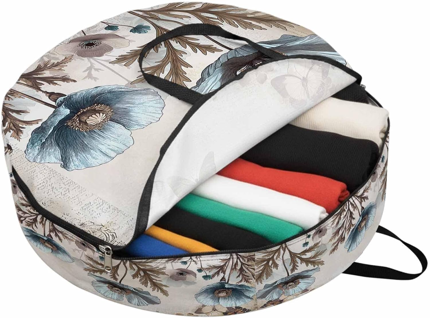 Reclaim Your Closet Space with the Round Storage Solution! Material: polyester Diameters: 24 inch, 30 inch, 36 inch Depth: 7 inches Package Includes: Round Storage Bag One Bag, Endless Possibilities: Whether you are swapping out your summer wardrobe, moving into a new dorm, or packing away holiday decorations, this bag has you covered. The circular design is uniquely suited for: Bedding: Comforters, quilts, sheet sets, and oversized pillows. Clothing: Winter coats, sweaters, and bulky ski gear. Home Decor: Holiday wreaths, garlands, and floral arrangements. Outdoor Gear: Camping blankets, sleeping bags, and beach towels. Dual Zippers: The high quality double zipper design allows the closet organizer to open wide from both sides, making it effortless to load and unload even the bulkiest comforters or wreaths. Reinforced Handles: Sturdy, reinforced handles are securely stitched to provide extra strength and a comfortable grip when carrying heavy loads or pulling the bag from under a bed. Clear Label Pocket: A transparent built-in label holder allows you to quickly identify the contents of each bag without ever having to unzip it, keeping your storage perfectly organized.