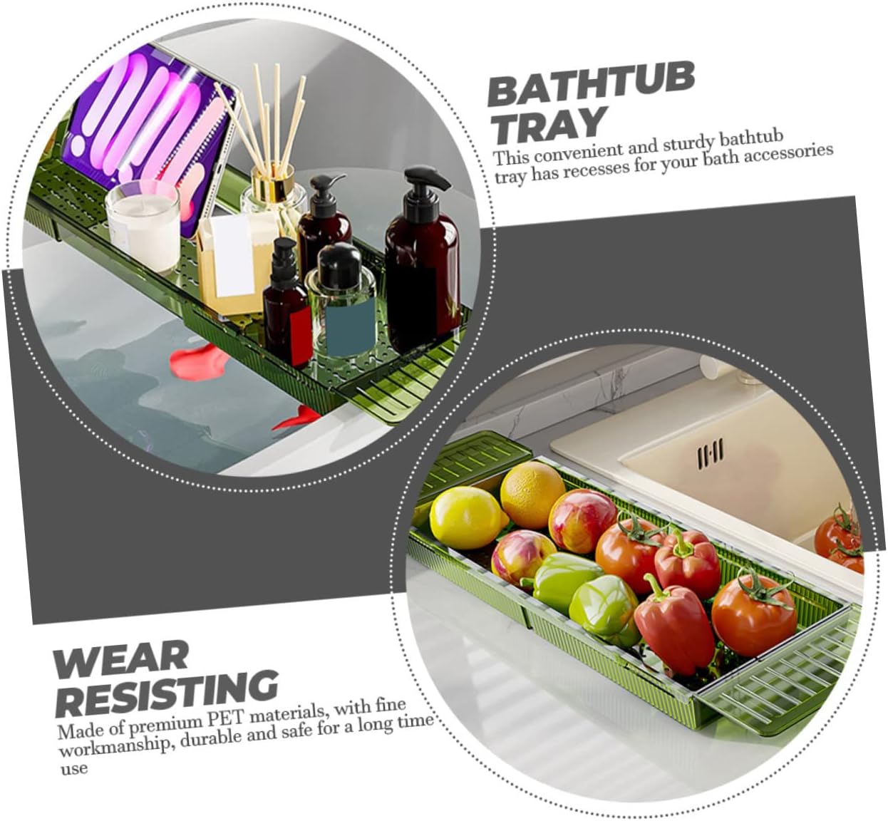 Package List 1 x bathtub tray Features -Color:Green bath holder -Material:PET bath accessories for men -Size:80.00X17.50X4.50cm/31.44X6.88X1.77in bathroom organizer -The bathtub tray can hold your tablets, magazine, book or any other reading material and wine glass, etc bath table tray. -With an expandable design, you can adjust it according to your needs to fit the bathtub bathroom tub tray. -Drinking a glass of wine and a cup of tea or coffee on your bathtub it and enjoy a time bath tray plastic. -This bathroom tray is a great present idea for birthday, Christmas, Valentine's Day, housewarming, and more bath accessories. -It has a simple design, but very practical in use. Its smooth surface and material makes it easy to clean bathrub tray.Goods Descriptionplastic bath tray And when you are not taking a bath, it also can be used a storage rack to store some cleaning items.bathroom tub tray With such a practical bathtub tray, more convenient for you to watch your favorite book or movie while taking a bath without worrying that the book or your tablet will get wet