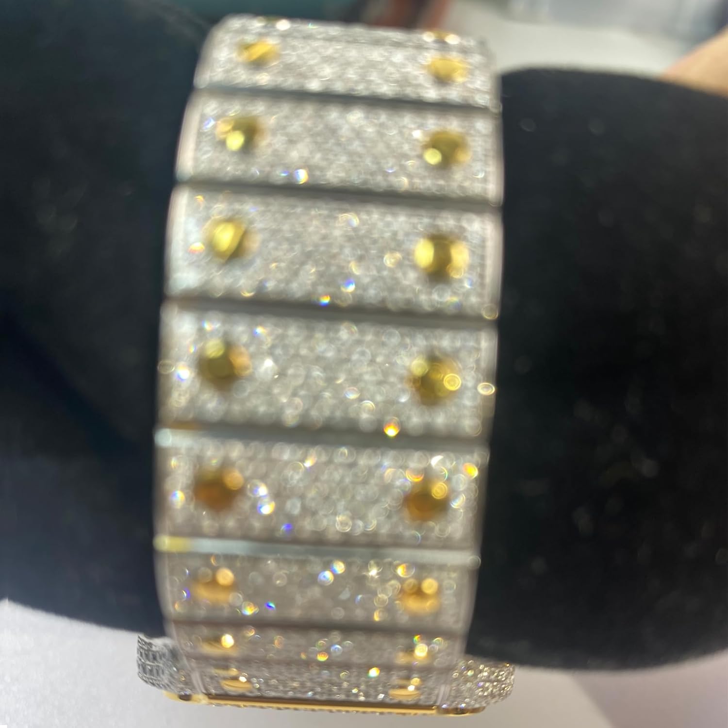 1. Compatible cartier santos series watch,dial、bezel、case and strap are inlaid with diamonds.you can choose cubic zircon、 moissanite diamond、lab-grown diamond, natural diamond, other gemstones) 2.Master craftsmen spend 72 hours meticulously crafting, perfectly blending luxury and technology. Unique、perfect fit and premium feel, it becomes a truly precious gift. 3、Support customization.We can also inlay any other model of watch you choose,choose any gemstone.The gemstones can be provided by you, and we only charge for labor costs. 4、The production will be completed within 3 working days after the order is placed, and the delivery will take 3-15 working days. The selling price includes customs duties and logistics fees. 5、Taking model W2SA0009 as an example,it is composed of 2524 diamonds, with 13 carats of diamonds (including 354 diamonds on the case and 1478 diamonds on the bracelet,110 on the Bezel , 582 on the dial).Diamonds color: F/G, clarity: VS, cut: 3EX.