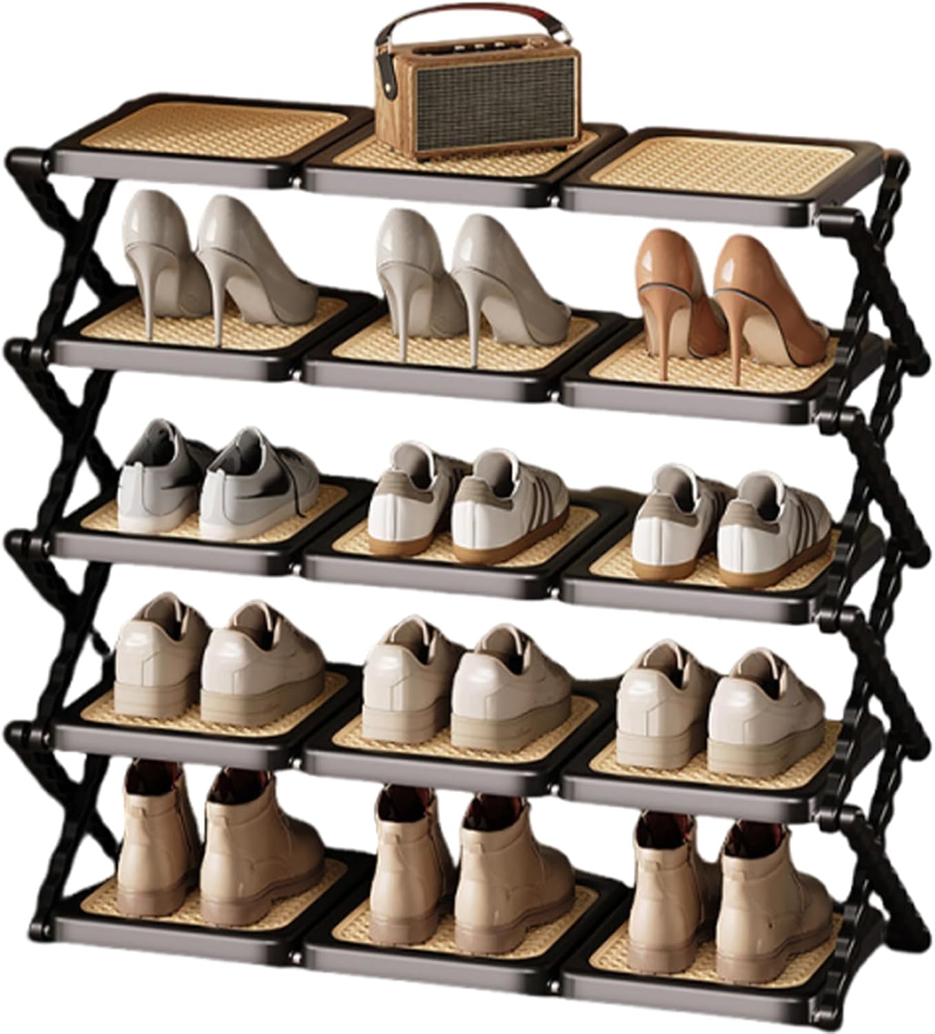 ● The shoe rack features an X-shaped cross-expanding structure; it requires no assembly—simply unbox and use immediately. When not in use, it can be folded up with a single motion for storage, taking up minimal space and making it highly convenient to transport during a move.● The vertical spacing between the rack's tiers is freely adjustable: a maximum height of 19 cm accommodates high-top shoes and boots, while the standard 14 cm spacing is suitable for high heels, athletic shoes, and casual footwear.● The rack utilizes storage panels with a faux-rattan woven design, offering both breathability and a stylish aesthetic. These panels boast strong load-bearing capacity and are resistant to deformation; their smooth surface is easy to clean—simply wipe to restore their pristine look.● Constructed with thickened and reinforced X-shaped support frames, and fitted with non-slip foot pads, the rack features a stable structure with exceptional load-bearing strength. Each tier can support up to 10 kg, ensuring both safety and durability.● The shoe rack showcases a minimalist, "light luxury" design featuring a black frame paired with rattan-style accents. It is versatile enough to suit various settings—including entryways, living rooms, studies, or tucked beneath office desks—serving as both a practical storage solution and a stylish decorative element for your space.Note: As the product dimensions are measured manually, a margin of error of 1–3 cm may occur; please refer to the actual product for precise measurements.Please note that colors may appear slightly different due to variations in lighting, monitors, mobile devices, viewing angles, and individual color perception.