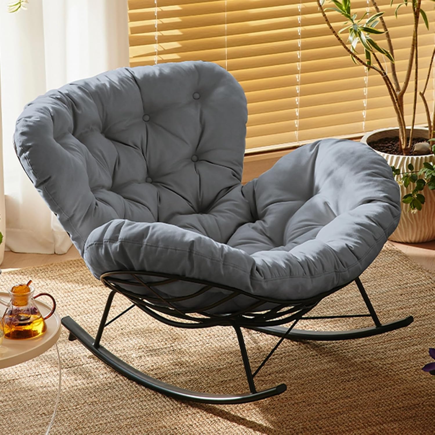 ➤ Features:✔ The egg-shaped silhouette design is paired with a quality cushion to create our elegant and stylish modern rocking chair. Such a simple and atmospheric appearance makes the lounge chair eye-catching anywhere.✔ The comfy chair rocks forward and backward no more than 30 degrees, smooth rocking provides better comfort, and no need to worry about rollover.✔ The curve of the porch chair is ergonomically designed and fits your body curve well. Lying on it will give you a good sense of wrapping, and the wider cushion allows you to fully relax your body.➤ Product specifications:Product name: rocking chairStyle: simple and modernColor: White , Dark grey , Light greyMaterial: Carbon steel frameFabric:Suede fabricFilling: Doll cotton fillingProduct size: 120*100*65cmUsage scenarios: bedroom, living room, balcony, terrace, garden and other leisure areas➤ Packing List: Rocking chair x1➤ Thank you for visiting our store, whether you buy this item or not. If you like something, you can add it to your cart or save it to your collection. If you need to purchase in the future, please check our store anytime.