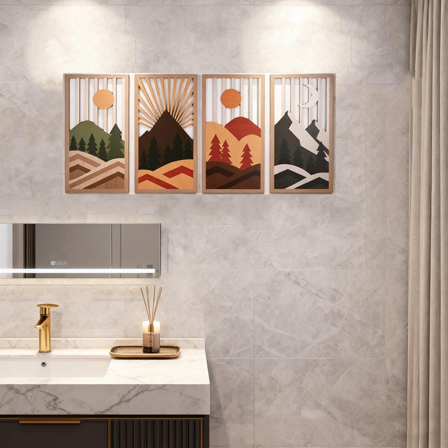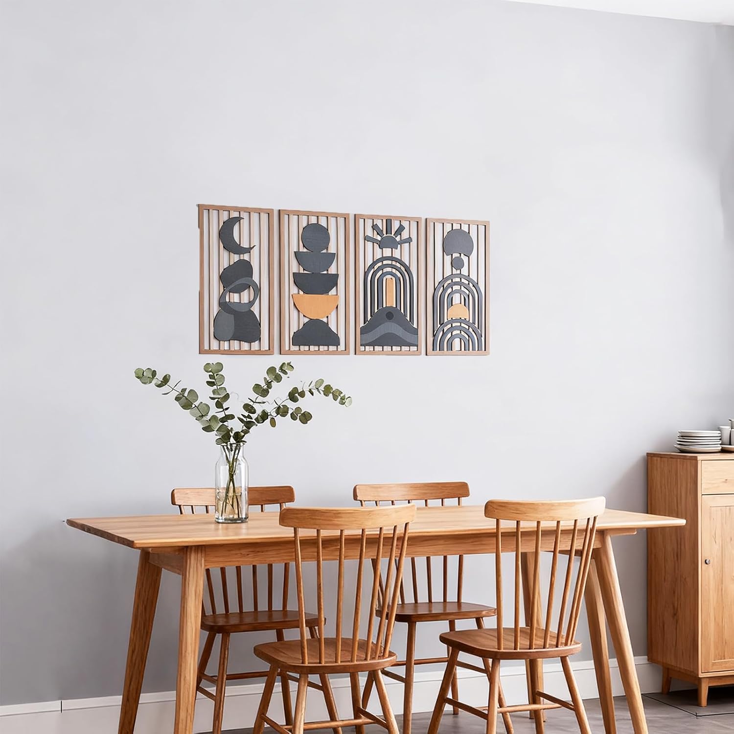 | Recommended Uses For Product | Bedroom Headboard Focal Point:Hang the 4-piece set horizontally above your bed as over bed wall decor. The artistic silhouettes complement your bedroom wall art and pair perfectly with linen bedding for a cozy vibe., Boho Corner Curator:Pair with macramé tapestries and succulents to create a boho wall art nook on your balcony or bay window. Geometric lines and natural-inspired motifs align with the nature theme., Entryway Narrow Wall Solution:Leverage the narrow wall art vertical design by hanging it vertically in your hallway. It solves "hard-to-decorate" slim spaces and boosts your aesthetic room decor instantly., Living Room Sofa Accent:Split the set into two pairs and hang them on either side of your sofa as wall art living room additions. Match with greenery and rattan furniture to nail the farmhouse wall decor style., Office Cubicle Pick-Me-Up:Use 1-2 narrow pieces above your desk for office wall decor. The wood grain details ease work fatigue, fitting both minimalist and eclectic office spaces. |