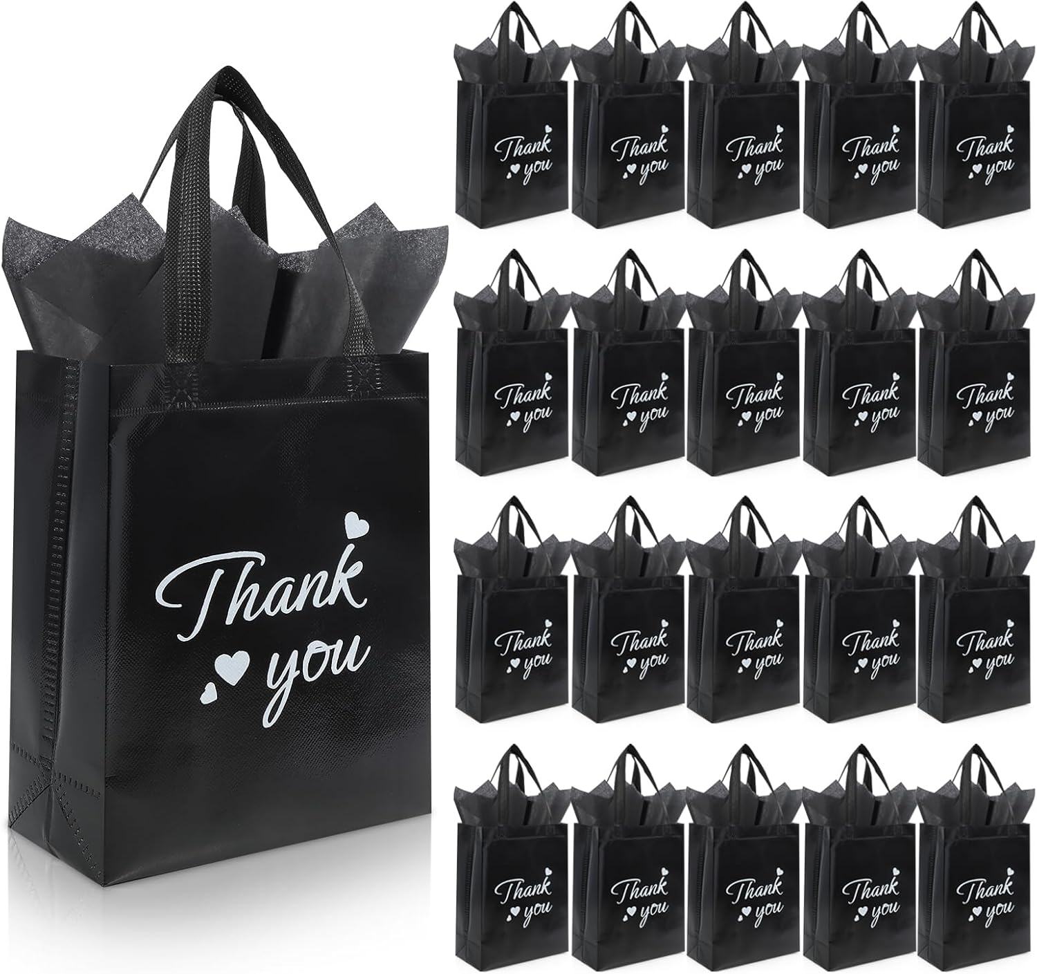 Express your gratitude with heartfelt sincerity through thoughtful packaging. Our “Thank You” themed gift bag set is designed for individuals and businesses needing to convey appreciation frequently and elegantly, seamlessly blending practicality with refined style. The set includes 40 thoughtfully designed thank-you gift bags, 40 matching tissue sheets and 40 Cardboard Bases—ready to use right out of the box, saving you time on tedious wrapping. Each bag features a clear, classic “Thank You” print, simple yet sophisticated, directly conveying your heartfelt appreciation to recipients. We understand the importance of durability and sustainability. Crafted from premium non-woven fabric, these bags are sturdier than ordinary paper bags, allowing for reuse and reducing single-use packaging waste. The reinforced stitched handles offer comfortable grip and strong load-bearing capacity, ensuring safe transport for books, cosmetics, snack gift boxes, or office supplies. The moderate dimensions of 8 inches x 10 inches x 4 inches provide ample space for most gifts while folding flat for easy storage at home or in the office. Its timeless design makes it versatile for various occasions: corporate employee recognition, team event gifts, client appreciation, or personal gestures like thanking teachers, healthcare workers, wedding favors, or birthday celebrations—always a thoughtful and dignified choice. For businesses requiring bulk purchases, this set delivers outstanding value and consistency, making it an ideal solution for corporate gift programs, holiday celebrations, or employee appreciation initiatives. Choosing our reusable thank-you gift bags represents not only a smart purchase but also a commitment to quality and sustainable living.