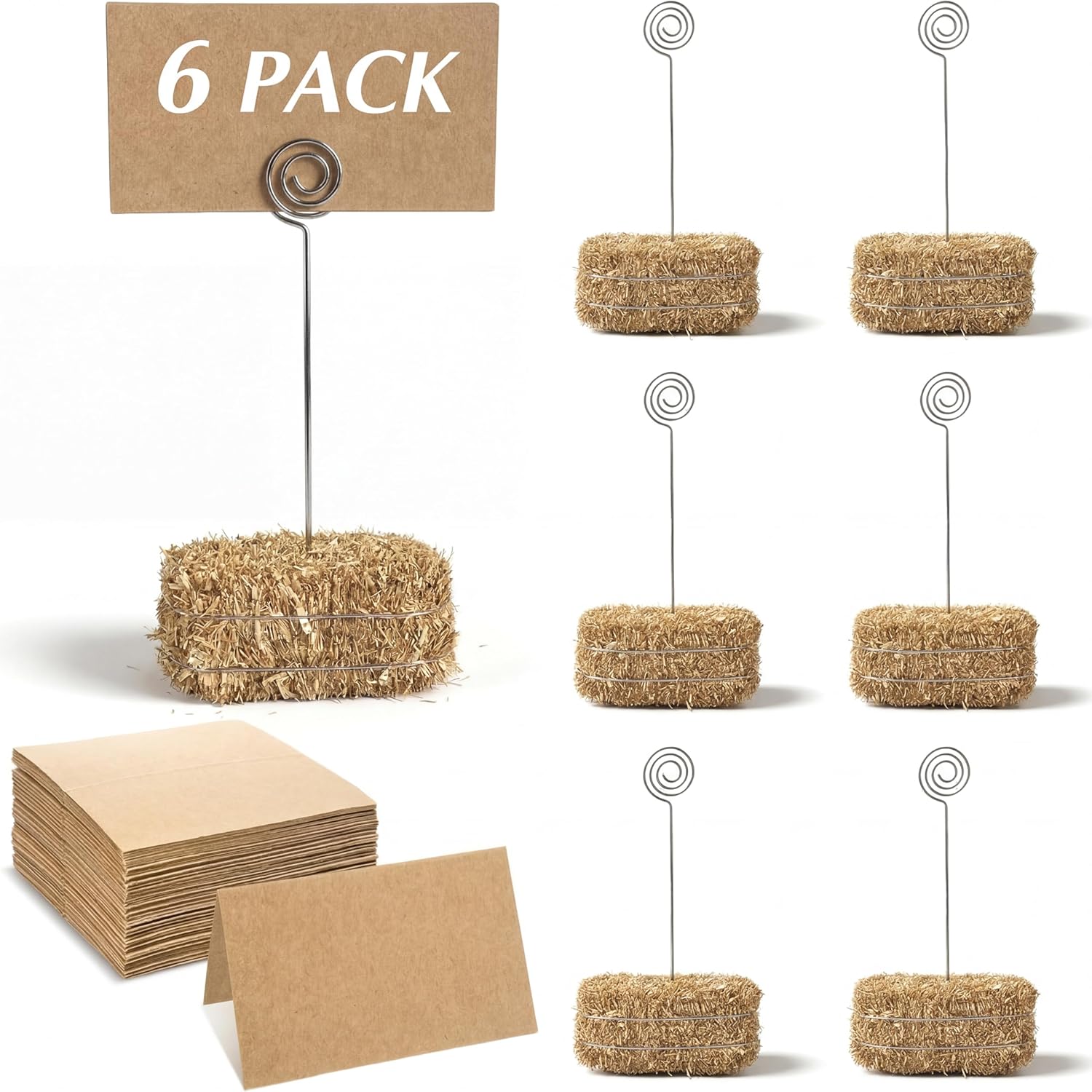 Features: Infuse Spaces with Rustic Charm Whether aiming for a Western cowboy theme or a cozy country feel, the rustic hay bale place card holder set infuses any space with the desired ambiance. Suitable for multiple settings, it's your go-to decor tool to create a welcoming, rustic atmosphere, regardless of the occasion. Ideal Gift Choice Offering a ideal blend of function and aesthetic, this rustic hay bale place card holder is an ideal gift for friends, family, or colleagues hosting a country themed party or event. Whether you plan to secure photos, names, or crafts, this product serves as an exceptional decorative gift, enhancing any rustic setting effortlessly. Specifications: Material: straw, wire, kraft paper Color: brown Size: Hay bale: 2.5 x 1 x 1 inch Spiral metal clip: 5.3 inch Kraft paper card: 3.5 x 2 inch Package includes: 24 x Mini Hay bale 24 x Kraft paper place card 24 x Silver spiral metal clip Notes: Manual measurement, please allow slight errors on size. The color may exist a slight difference due to different screen displays