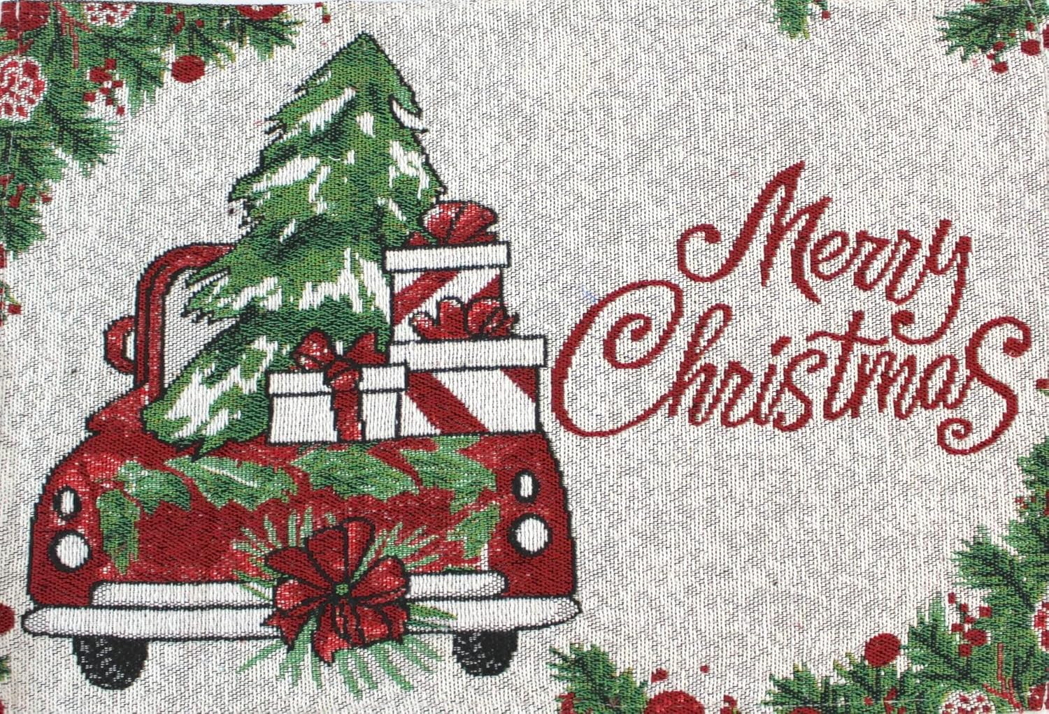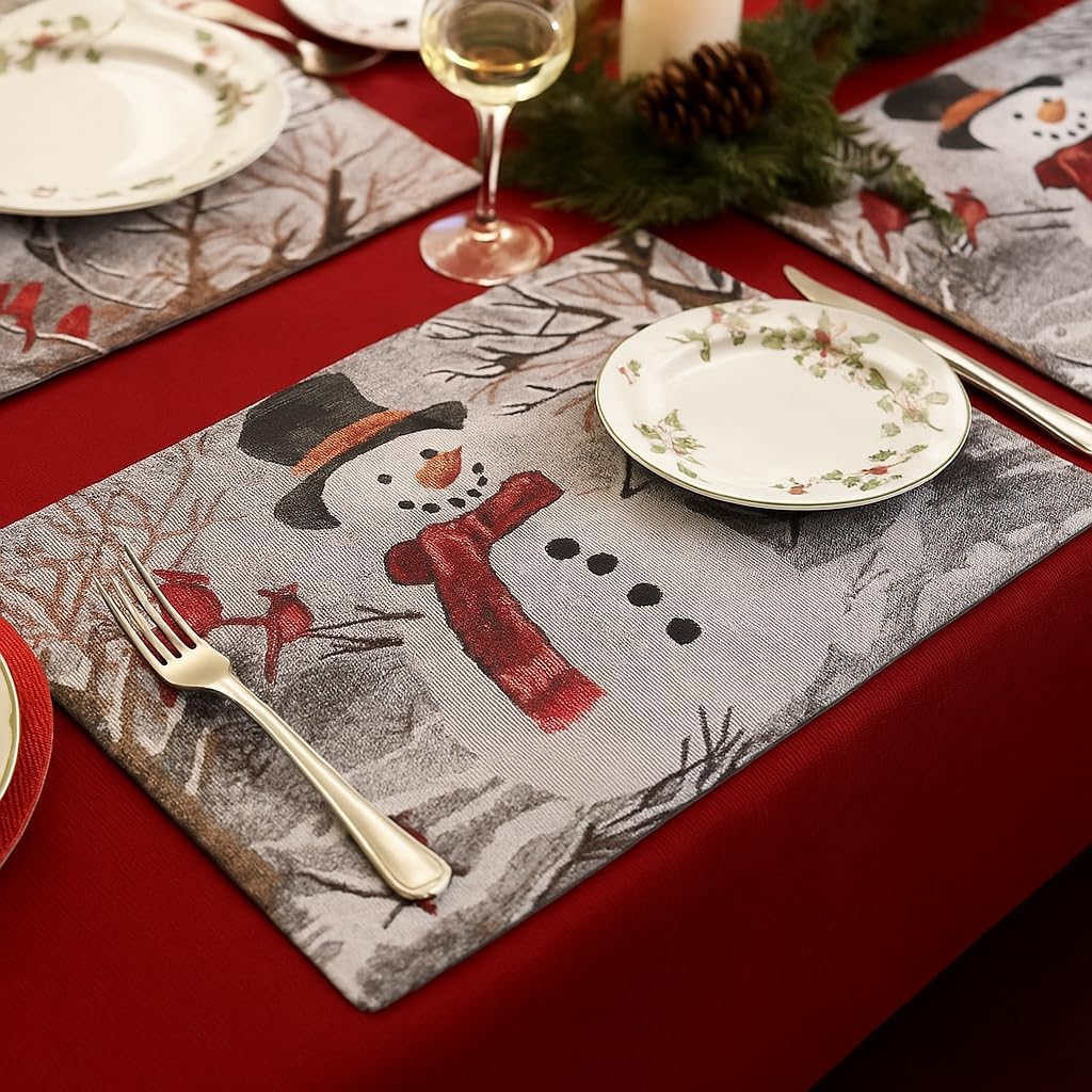 Elevate your holiday and winter table décor with this exquisite 13 x 19" tapestry placemat, meticulously crafted from a premium blend of 60% cotton and 40% polyester for durability, softness, and long-lasting charm. The placemat showcases a captivating winter scene that immediately brings a cozy, festive feel to any dining experience. At the center of the design, a friendly snowman wearing a classic black top hat and vibrant red scarf stands proudly, greeting guests with cheerful warmth. To the left of the snowman, a small red wheelbarrow adds a rustic touch, enhancing the scene’s nostalgic appeal. In the background, a small red barn or house nestles among snow-covered evergreen trees and bare, dark deciduous trees, creating a picturesque winter landscape reminiscent of a serene countryside holiday. The carefully chosen color palette includes crisp whites for freshly fallen snow, multiple shades of green for the trees, rich reds for the barn, scarf, and wheelbarrow, and deep blacks and browns for tree trunks, all set against a light tan tapestry weave background adorned with delicate white snowflakes. The woven tapestry fabric ensures both elegance and practicality, offering a placemat that is resilient enough for daily meals yet stylish enough for special occasions, holiday gatherings, and winter-themed celebrations. Its generous 13 x 19" size provides ample coverage to protect your table from spills, scratches, and heat, while the blend of cotton and polyester delivers a smooth texture that is soft to the touch yet easy to maintain. Perfect for creating a warm and inviting table setting, this placemat pairs beautifully with other seasonal décor items, adding a touch of traditional holiday spirit to your home. Whether you’re hosting festive family dinners, casual winter lunches, or celebratory gatherings, this tapestry placemat offers a timeless design that enhances every meal with seasonal beauty and charm, making it a must-have for winter décor enthusiasts.