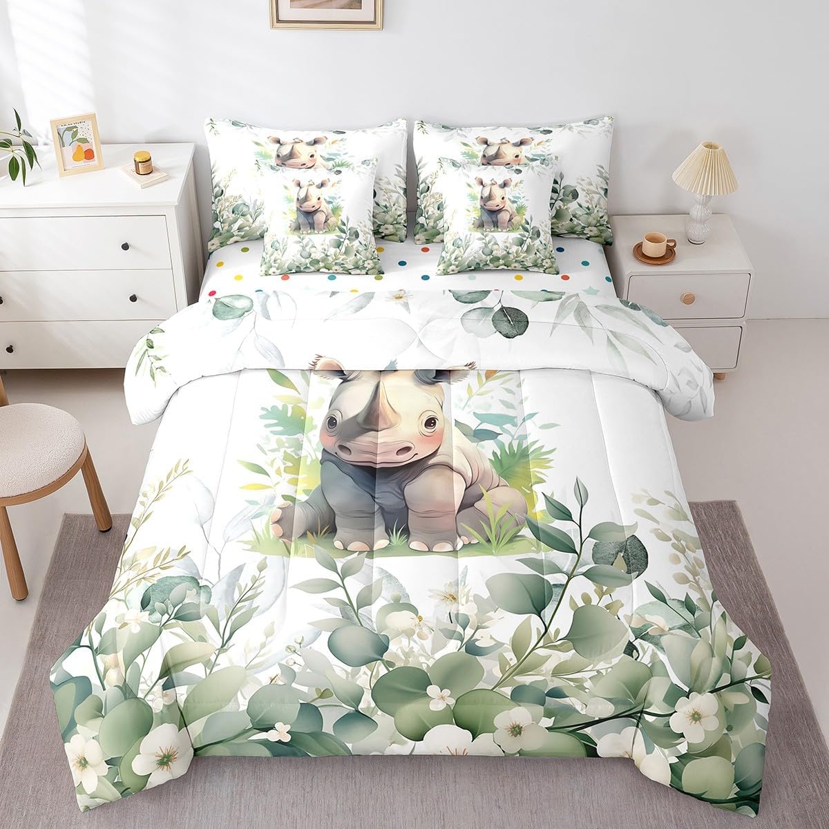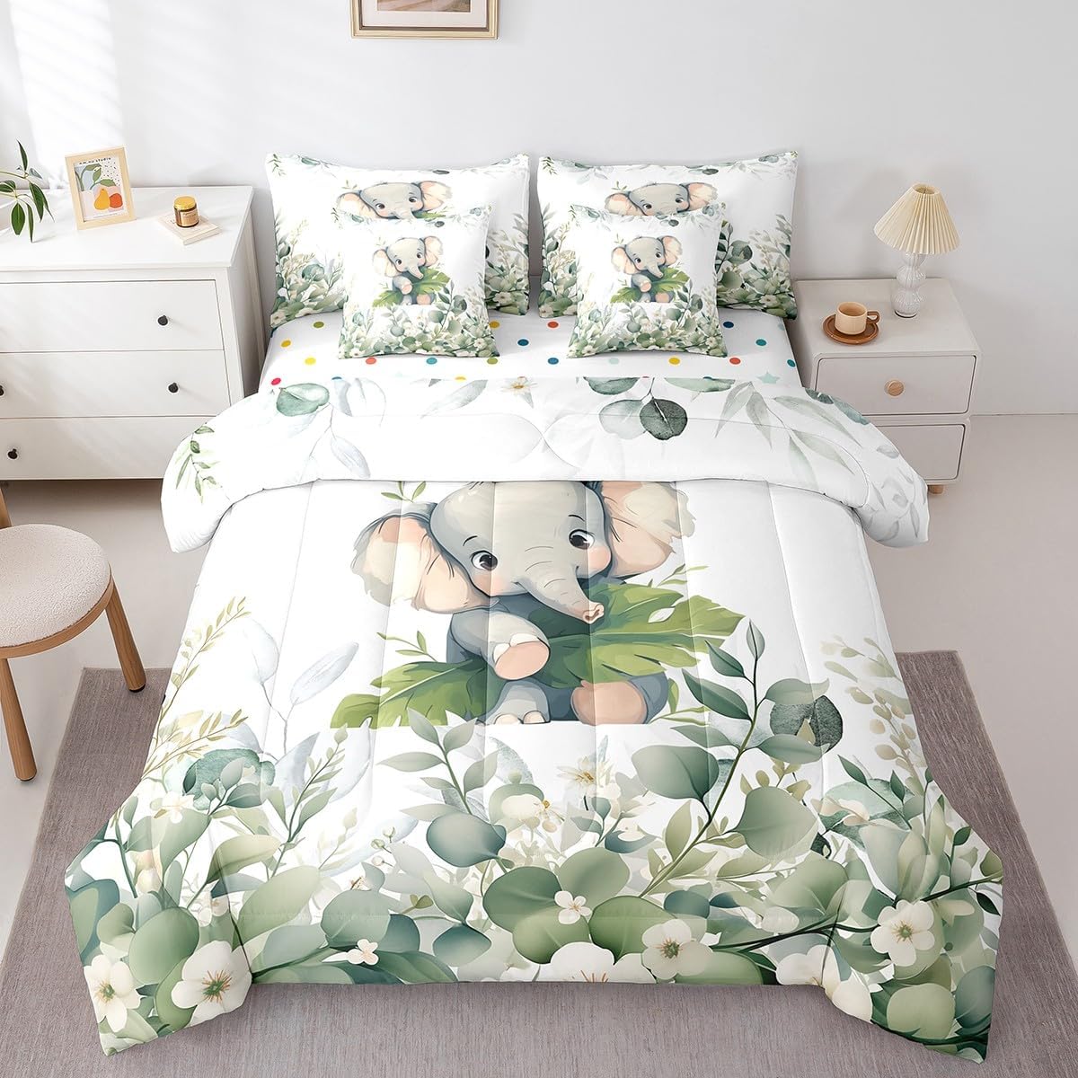 Vibrant Bedding Set: This 7-piece comforter set features a lively print with eucalyptus leaves, cartoon animals, woodland wildlife, spring garden leaves, and tropical botanical plants