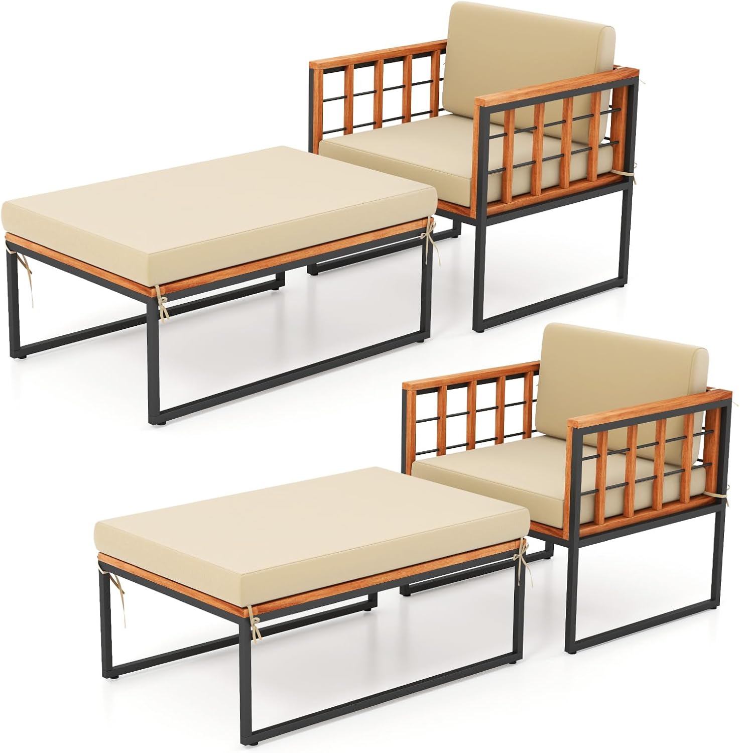 Description: Embrace relaxation with this 2-piece acacia wood patio set, combining a sturdy metal-framed armchair and versatile ottoman for ultimate comfort and durability. The main frames of the 2 pieces are made of acacia wood and metal for high stability. The ottoman doubles as a footrest or an extra seat, holding up to 800 lbs. And the armchair is also sturdy and comfortable. The soft cushions with secure ties will bring you more coziness, too. You can use the armchair and ottoman separately as a conversation set, or together as a patio chaise lounge. All in all, this set is an excellent addition for enhancing the coziness of your outdoor spaces. Features: Acacia wood frame for more elegance and durability Heavy-duty metal pipes offer excellent support Adjustable footpads for higher stability Comfortable to sit with soft cushions Smooth zippers for easy removal and cleaning of cushion covers Fixing ties keep the cushions in place Ottoman is perfect as a footrest or an extra seat Suitable for backyard, poolside, balcony and so on Specifications: Color of Cushion: Beige Material: Acacia Wood, Metal, Polyester, Sponge Dimensions of Armchair: 25” x 26” x 25”/63 x 67 x 63 cm (L x W x H) Dimensions of Ottoman: 35” x 23” x 12.5”/90 x 59 x 32 cm (L x W x H) Length of Lounge Chair: 60”/153 cm Seat Height from the Ground: 12.5”/32 cm Dimensions of Seat Cushion: 23” x 23” x 3.2”/59 x 59 x 8 cm (L x W x Thickness) Dimensions of Back Cushion: 14” x 23” x 3.2”/35 x 59 x 8 cm (L x W x Thickness) Dimensions of Ottoman Cushion: 35” x 23” x 3.2”/90 x 59 x 8 cm (L x W x Thickness) Total Net Weight: 44 lbs/20 kg Weight Capacity of Armchair: 400 lbs/180 kg Weight Capacity of Ottoman: 800 lbs/360 kg Package Includes: 1 x Armchair 1 x Ottoman 1 x Seat Cushion 1 x Back Cushion 1 x Ottoman Cushion 1 x Instruction