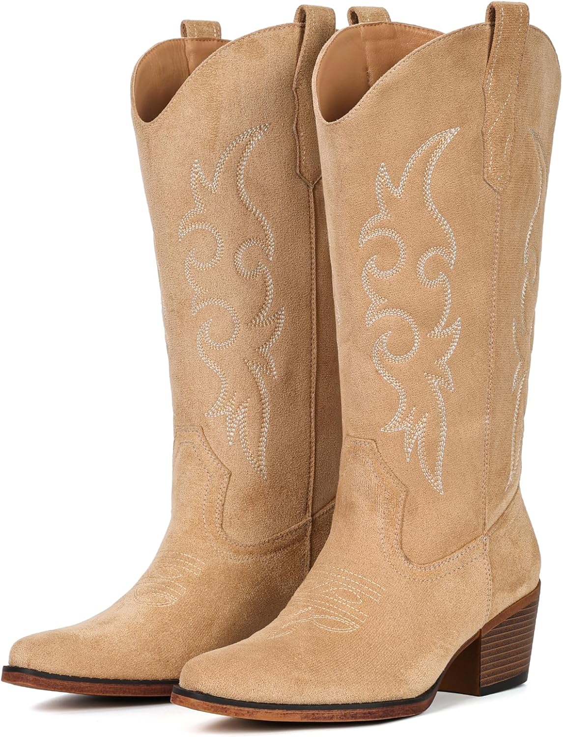 IUV Cowboy Boots For Women Western Cowgirl Boots Mid Calf Snip Toe Boot With Chunky Heel