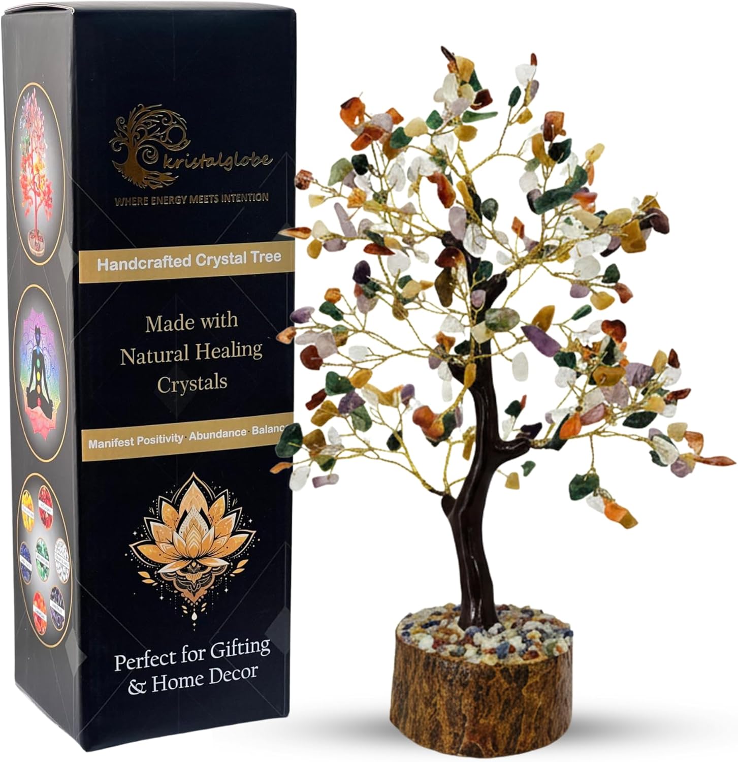 🌈 Elevate Your Space with the KRISTALGLOBE Seven Chakra Crystal Tree! Handcrafted with 300 natural gemstone chips and 100% pure copper wire, this stunning Tree of Life brings balance, healing, and positive energy into any room. Each stone is carefully selected and arranged to represent the seven chakras — Amethyst, Lapis Lazuli, Rose Quartz, Carnelian, Green Aventurine, Red Jasper, and Clear Quartz. ✅ 300 Natural Healing Crystals: Real stones for energy balancing and chakra alignment. ✅ Pure Copper Wire Build: Flexible yet durable hand-twisted branches. ✅ Natural Agate Slice Base: Polished grounding base for added stability and beauty. ✅ Handmade Craftsmanship: Every piece is uniquely crafted by skilled artisans. ✅ Versatile Spiritual Decor: Perfect for meditation spaces, yoga rooms, office desks, or as a meaningful gift. Whether you're looking to enhance your energy flow, beautify your surroundings, or give a thoughtful gift to a loved one, this chakra tree offers spiritual elegance and holistic benefits. Add harmony and healing to your space – order your KRISTALGLOBE Crystal Tree today!