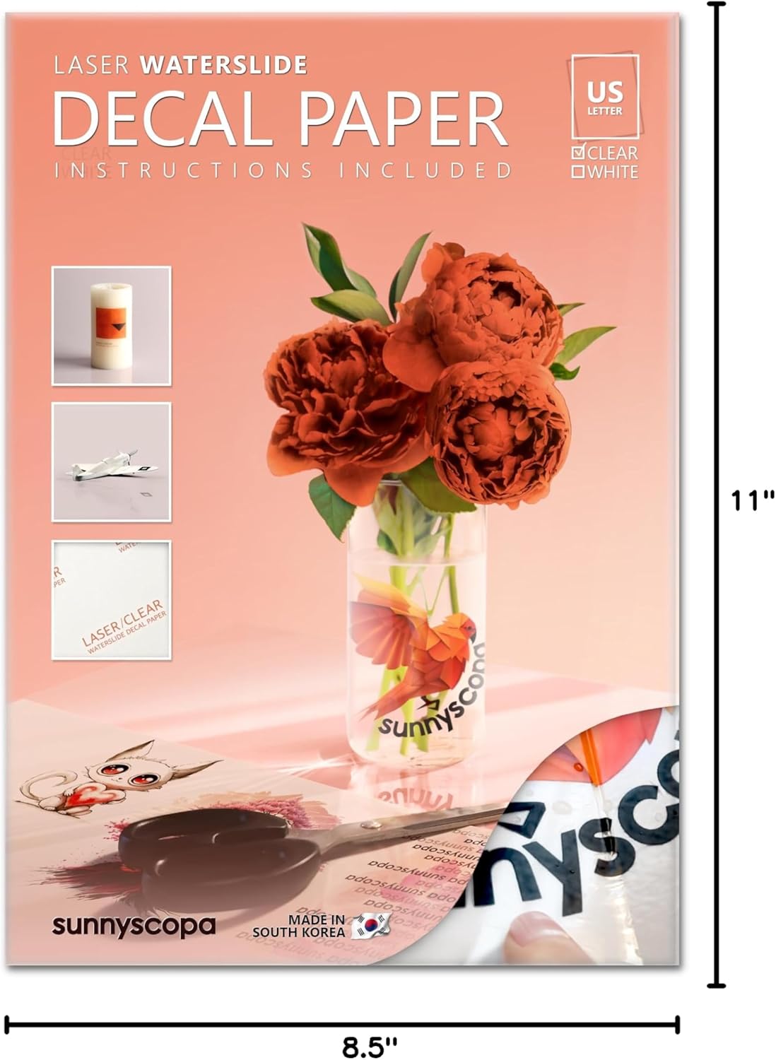 Sunnyscopa Waterslide Decal Paper for LASER Printer - CLEAR, US LETTER SIZE 8.5"X11", 100 SHEETS, Personalized Water Slide Transfer Transparent Printable paper - DIY Custom for Tumblers, Glasses, Mug